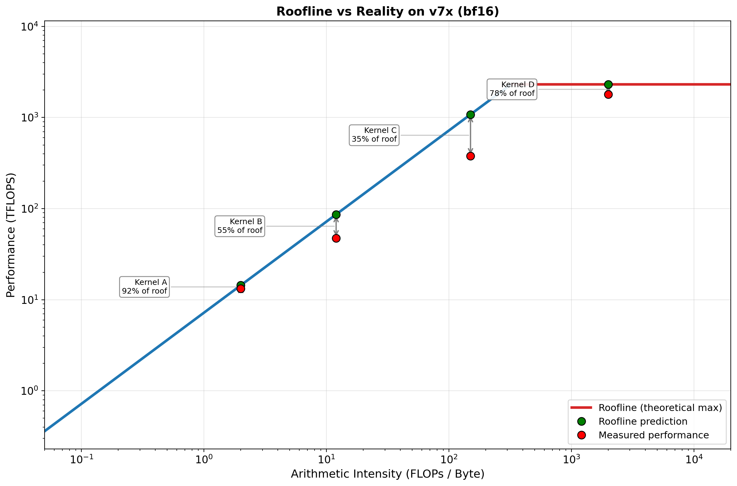 ax.annotate('', xy=(fused4_ai, fused4_perf), xytext=(unfused_ai, unfused_perf),