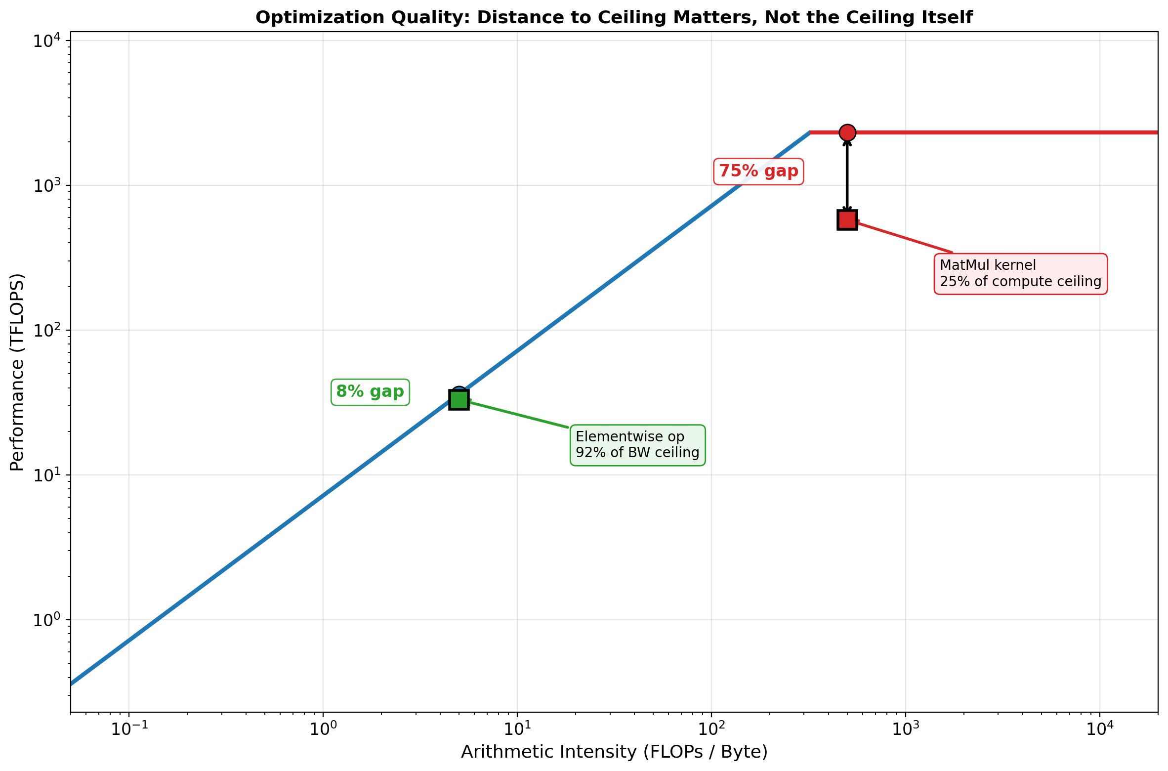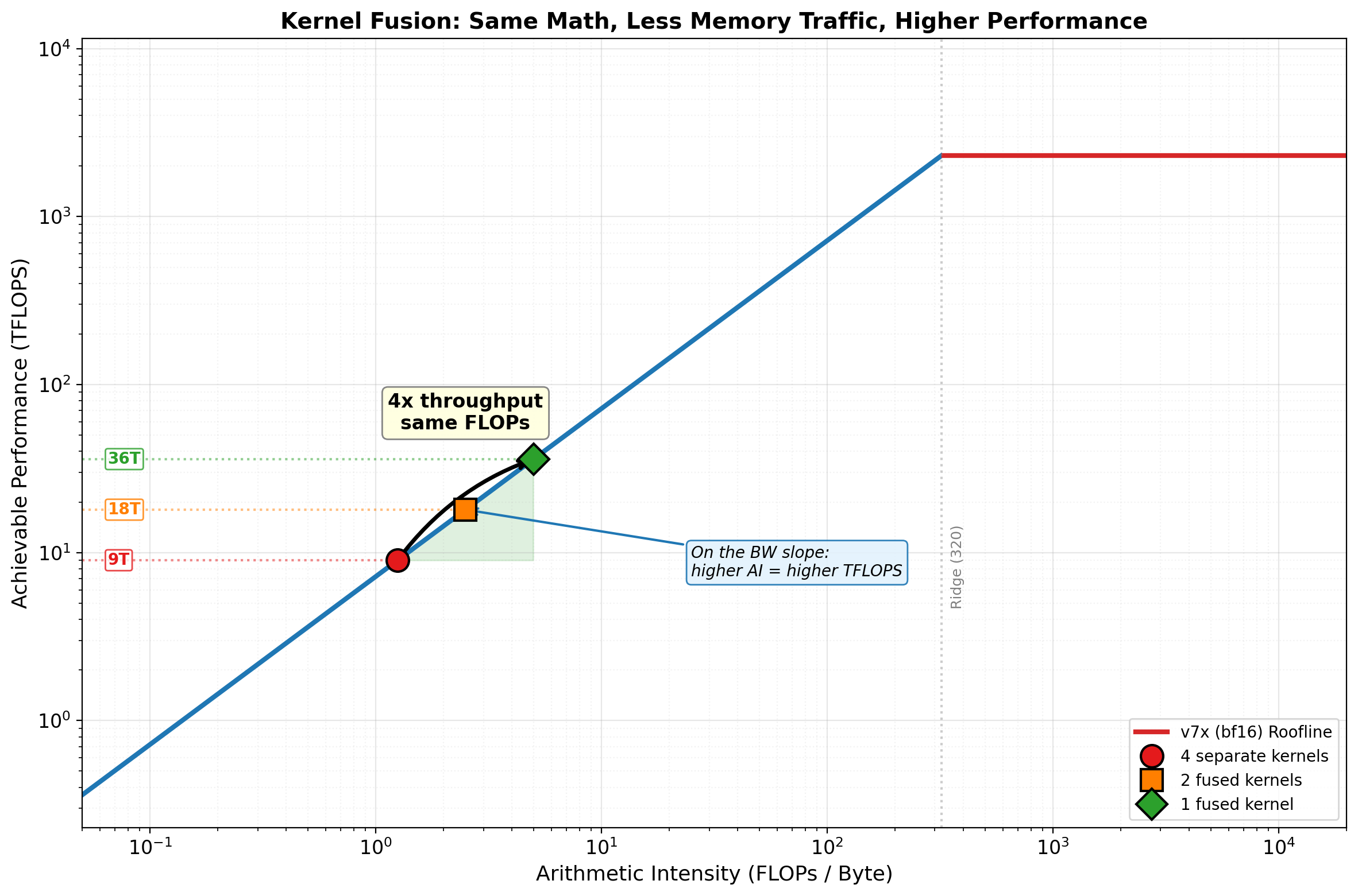 ax.text(mid_ai, mid_perf * 3, f'4x throughput\nsame FLOPs',